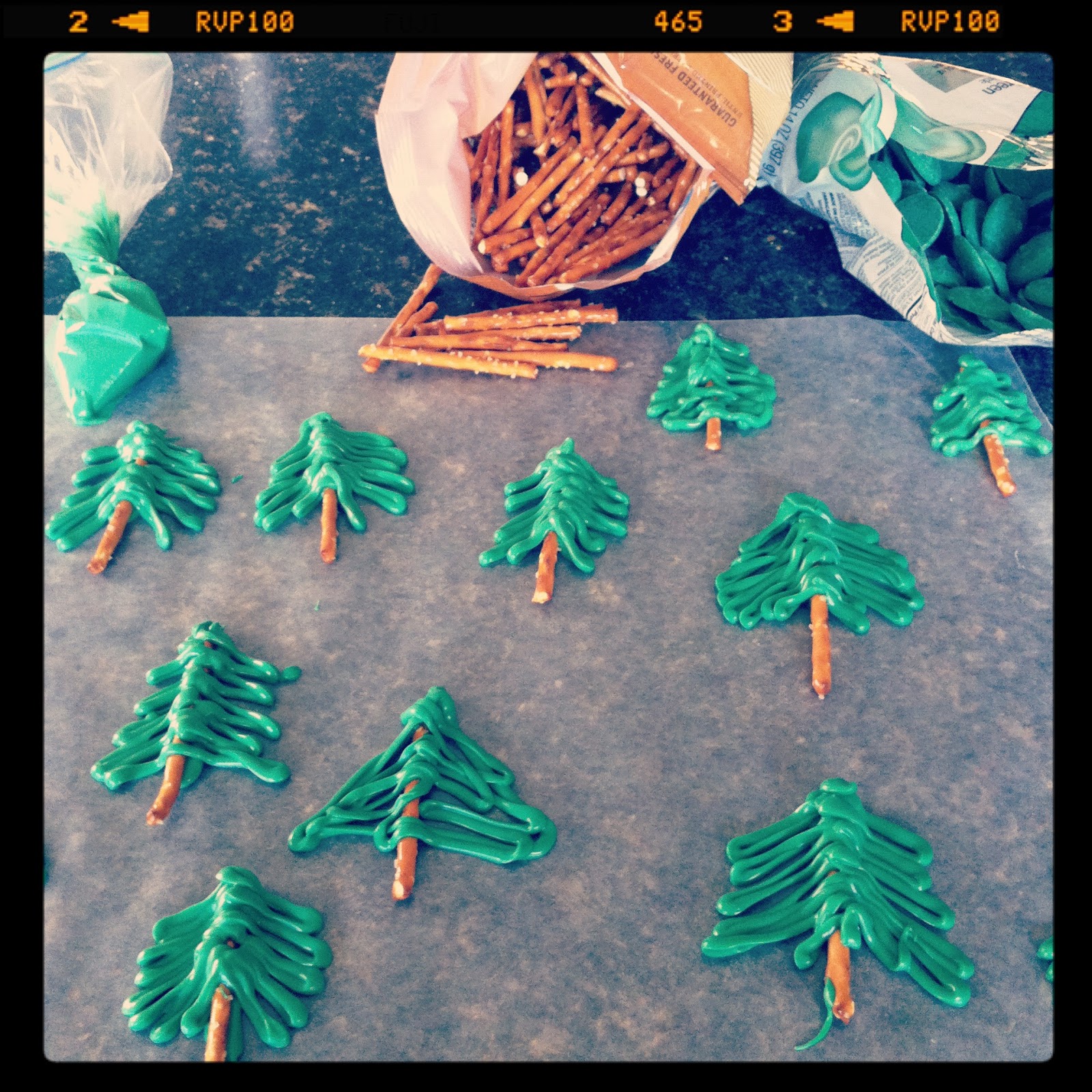Candy melt pretzel trees on coconut cupcakes!